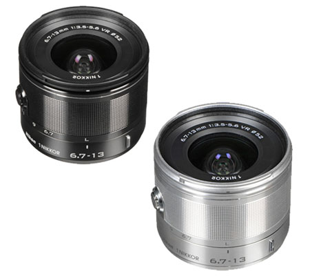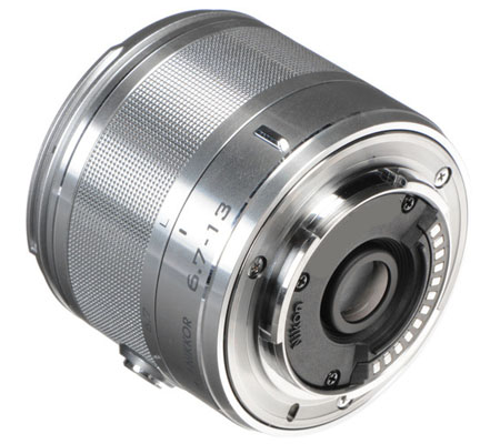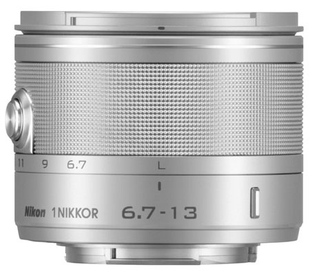 The silver 1 NIKKOR 6.7-13mm f/3.5-5.6 VR Lens from Nikon is a compact wide-angle zoom lens compatible with all Nikon 1 cameras equipped with the Nikon 1 mount. Its 6.7-13mm focal length is equivalent to 18-35mm in 35mm format, covering a range from a super-wide angle for landscapes and close group shots to an angle close to what you see with your eyes. This wide lens provides a 100° angle of view to bring more into the frame, as well as foreground-subject emphasis.