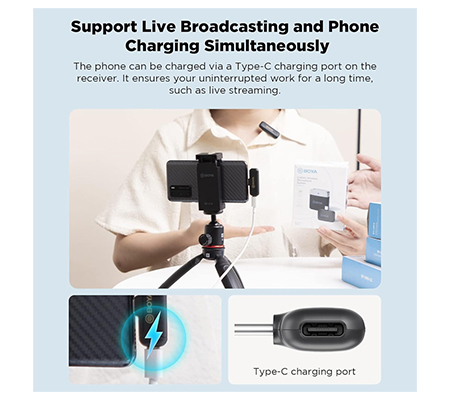 The receiver can be charged via the Type-C port during the recording, ensuring long working time without interruption.