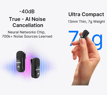The BOYA Magic features next-gen AI noise cancellation that intelligently separates background noise and keeps your voice crystal clear. Powered by a dedicated deep neural networks (DNNs) trained on 700,000+ real-world noise samples and 20,000 hours of deep learning, it separates voice from noise in milliseconds. Activate strong mode for up to -40 dB suppression in loud environments, or switch to light mode for up to -15 dB, reducing white noise while preserving natural ambience.