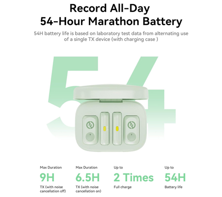Power through extended shoots with confidence. With the charging case and two swappable transmitters, the LARK A1 delivers up to 54 hours of continuous use—eliminating downtime and keeping you in the creative zone.