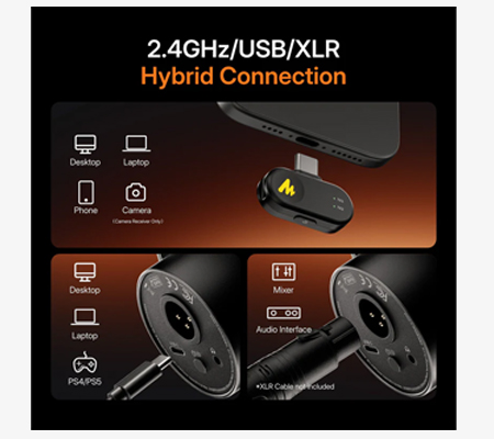 Stream, record, and connect to camera, phone, and laptop simultaneously via wireless, USB, and XLR.